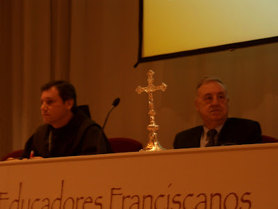 Tras un momento de oración comenzó la jornada del tercer día del Congreso, día 2 de noviembre. Este humilde bloguero fue el encargado de presentar, como responsable de la Pastoral Educativa de nuestro Colegio Franciscano de la Inmaculada, a Fray Johannes B. Freyer, Rector de la Universidad pontificia Antonianum de Roma. Freyer disertó sobre Los caminos educativos franciscanos. Para él, el camino franciscano es una itinerante y progresiva dirección hacia un fin bien concreto. Se busca hacer madurar un comportamiento, un hábito de vida, hacia ciertos valores. La persona y el total de la vida son importantes. Se toma conciencia del ambiente de la historia. No hay nada que se deba excluir en la Educación franciscana. Se asumen las contradicciones de la vida humana y lo negativo, todo utilizado para crecer. No solo se quiere formar a la persona en valores, sino también en el mundo en el que vive, una misión a cumplir con todo el ser. Un hombre más maduro y una vida más feliz son siempre posibles. Para ello,los caminos franciscanos de la educación y la formación son: el camino del bien que lleva a purificar los sentidos, el camino del conocimiento que purifica la mente, la razón, el camino de la libertad que purifica la voluntad de fantasía e imágenes engañosas, y el camino del diálogo que purifica nuestros modos de relacionarnos para no crear enemigos.Iº Congreso Europeo de Educadores Franciscanos