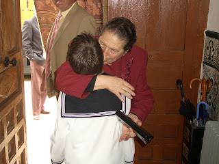 Será porque hay confianza y nos conocemos que tus palabras fueron un bonito regalo en este mes de mayo. Es verdad que tengo "mamitis", como mi sobrino tiene "abuelitis"; pero estas enfermedades mientras duren son muy sanas. Te confieso que esta fotografía, sacada en domingo pasado, día en el que mi sobrino hizo la Primera Comunión, es la que más me gusta. Cuando hice la Primera Comunión con mi hermano Pablo mis abuelos no fueron a la ceremonia y no sé si lo sabían. La hice la víspera de la Ascensión y el banquete fue una buena taza de chocolate con magdalenas. Mi abuela, Jorga, había fallecido mese antes de un galopante cáncer. Mi abuelo, Pablo, con la trombosis que sufría no sé si era consciente de lo que hicimos mi hermano y yo. Mis abuelos paternos, Facunda y Julián, creo que se enteraron al día siguiente. Soy consciente que me hubiera gustado mucho haber sentido la compañía de mi abuela, Jorga, pues al ser el mayor de cinco hermanos me crió y me enseñó a rezar. Me alegro mucho de que mi sobrino pudiera gozar de su abuela materna ese día tan especial para toda la familia.